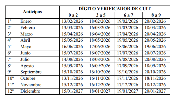 ARTÍCULO 1°.- Establecer para el ejercicio fiscal 2026, las fechas de vencimiento que se detallan en el ANEXO I que forma parte integrante de la presente, para la presentación y pago de las declaraciones juradas mensuales del Impuesto sobre los Ingresos Brutos correspondiente a contribuyentes locales del Régimen General determinadas en base al dígito verificador del número de inscripción en el impuesto.